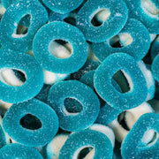 Bonbons gélifiés en forme de rondelles, au goût de framboise. Ingrédients: Sirop de glucose, sucre, eau, gélatine de bœuf halal,...