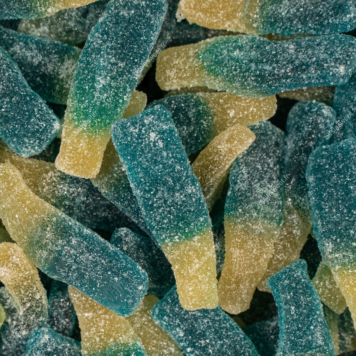 INGREDIENTS : Sirop de glucose, sucre, eau, gélatine de boeuf, amidon modifié de pomme de terre, acidifiants : E330, E270, agent d'enrobage : cire de carnauba, arôme, colorants : E133. Sans Gluten.