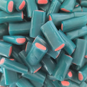 Bonbons gélifiés goût redbull en forme de mini bâtons halal avec enrobage bleu et garniture rose tendres.
