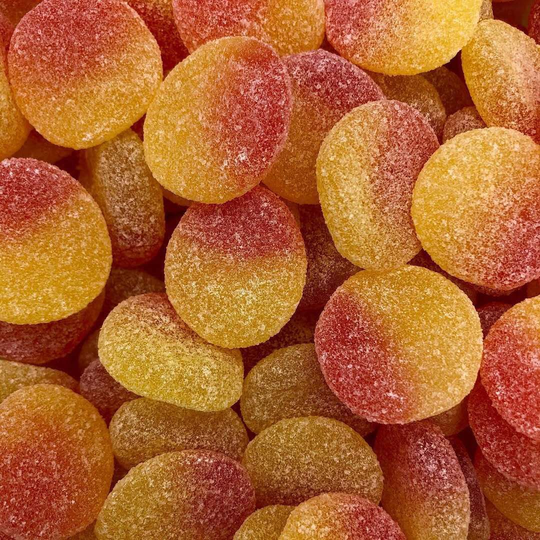 Bonbons bicolores et tendres au goût de pêche enrobés d'une couche de sucre. Ingrédients: Sucre, sirop de glucose, eau, gélatine,...